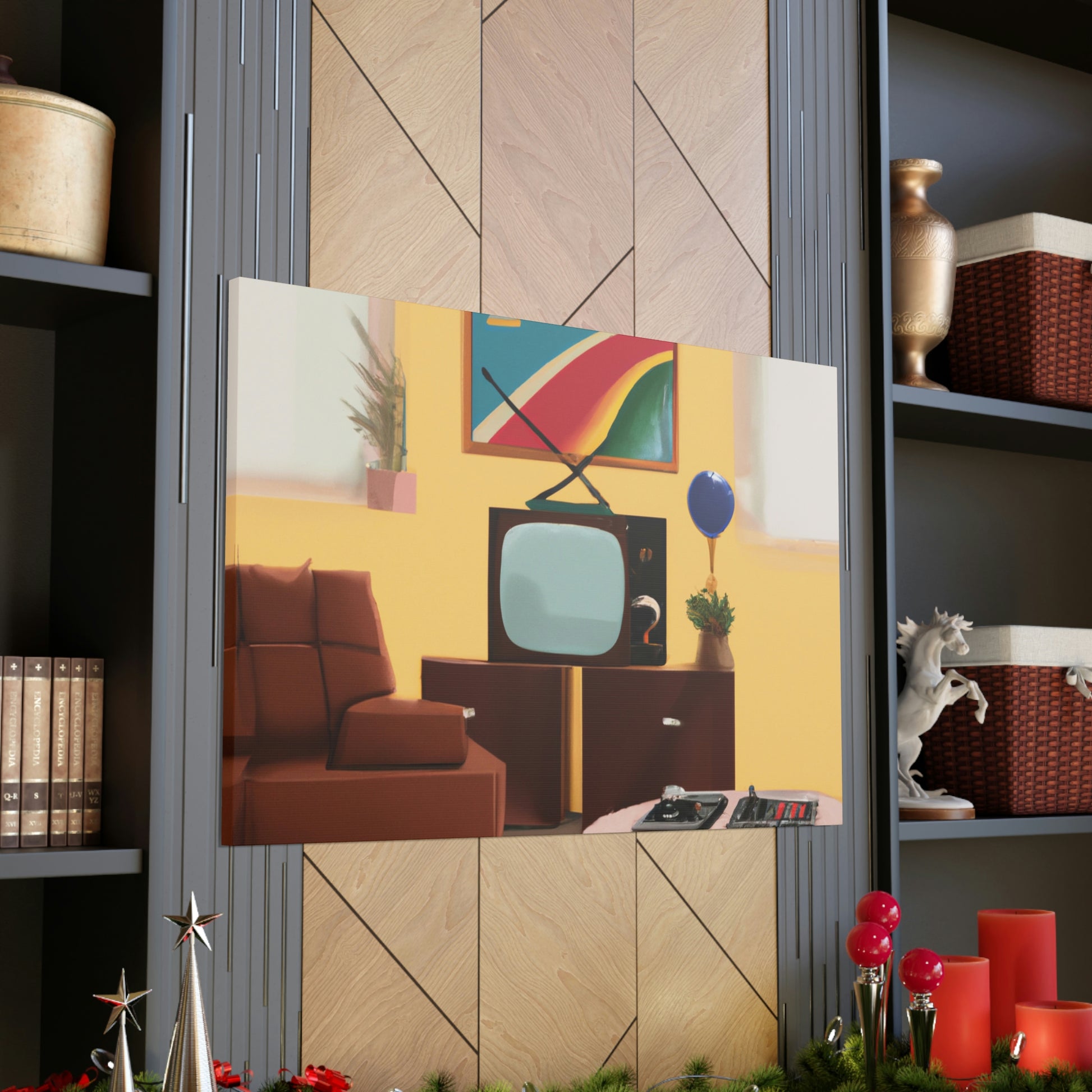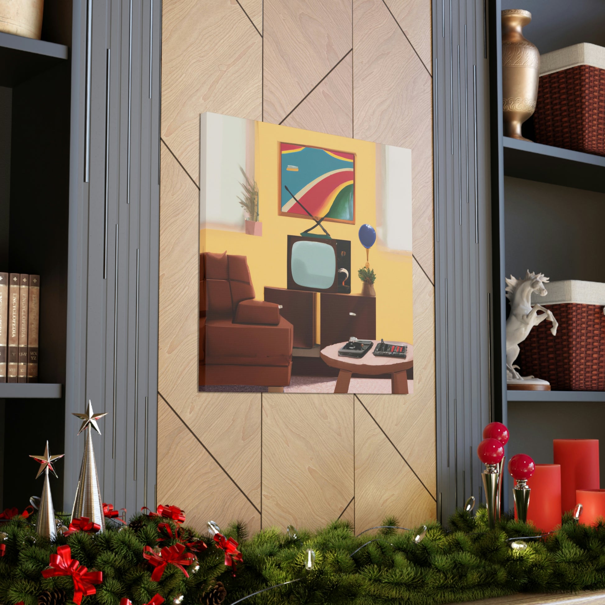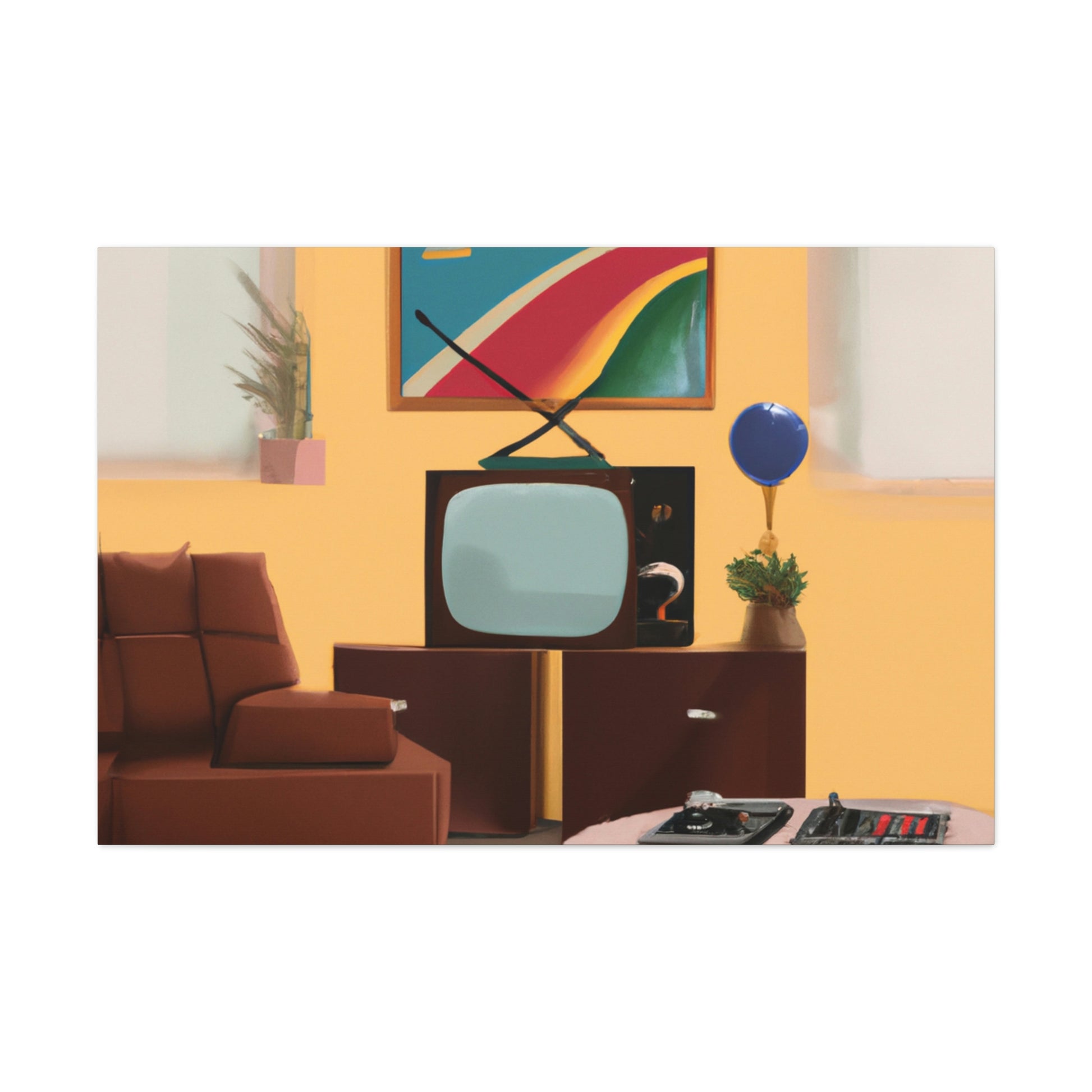 This canvas of digital art features a classic 80's painting that will be the perfect pop of colour for your living room. With its vivid hues of yellow, blue and green, this painting is sure to liven up any interior. Whether it's a focal point to start a conversation or a gentle background to relax in, this canvas is perfect and will last for years to come. #80sart #80sdecor #canvasart #canvasdecor #digitalart #livingroomdecor #homedecor #popofcolor #artforsale #vividcolors #interiordesign