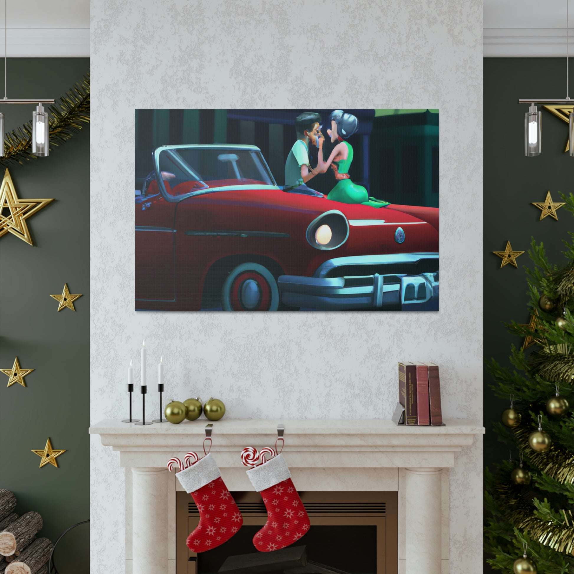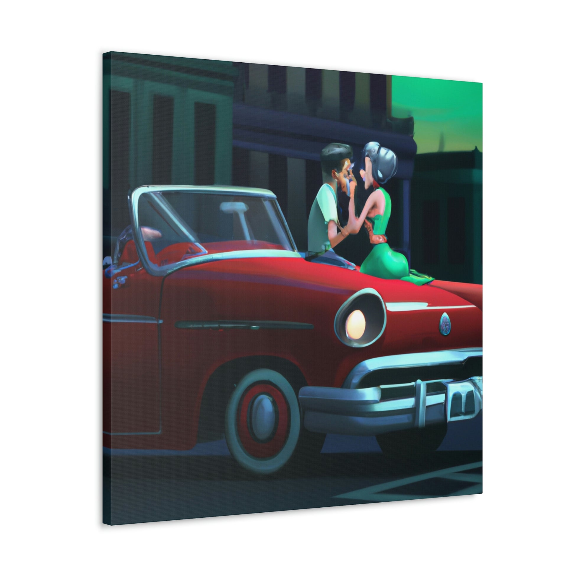 This 50's style rockabilly couple digital art print on canvas will take you back to the good ol' days! The vintage car parked outside adds to the allure of the romantic evening. Hang this piece in any home and add a touch of retro romance and nostalgia to your space. #50sstyle #rockabilly #vintagedecor #vintagecar #loveart #romanceart #digitalprint #canvasprint #nostalgia #retrostyle #romanticart