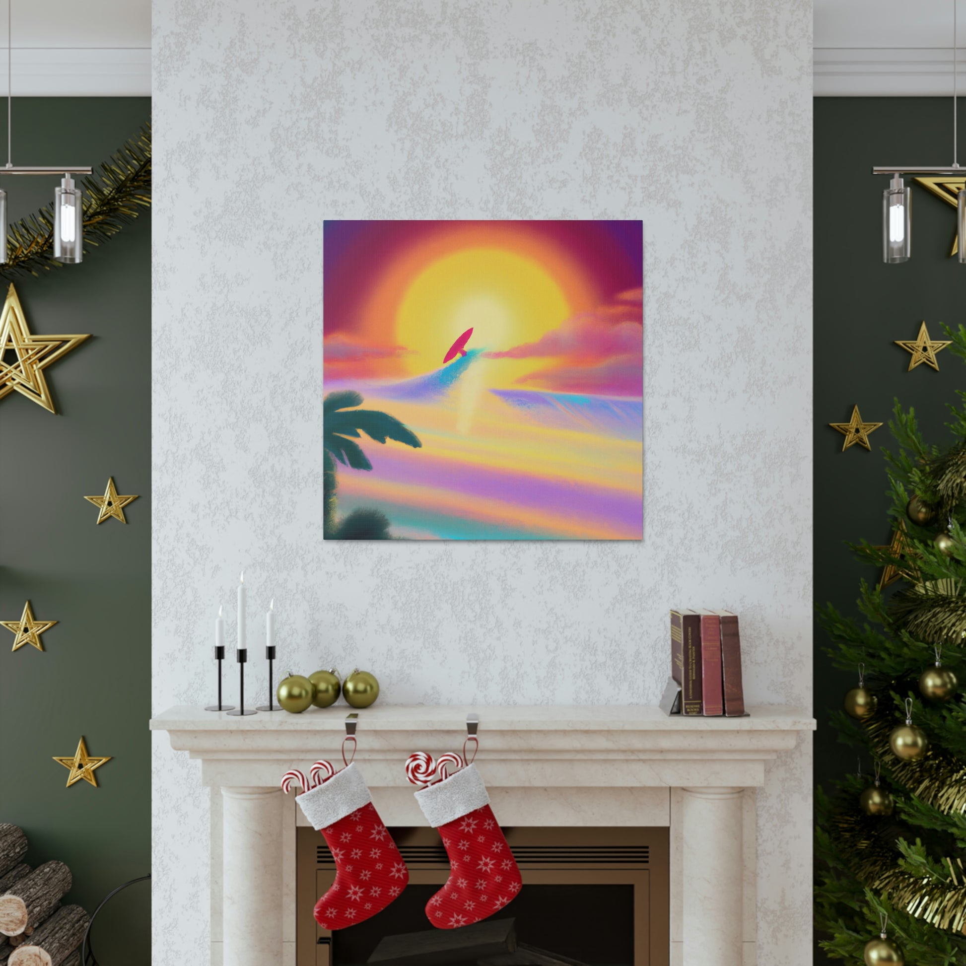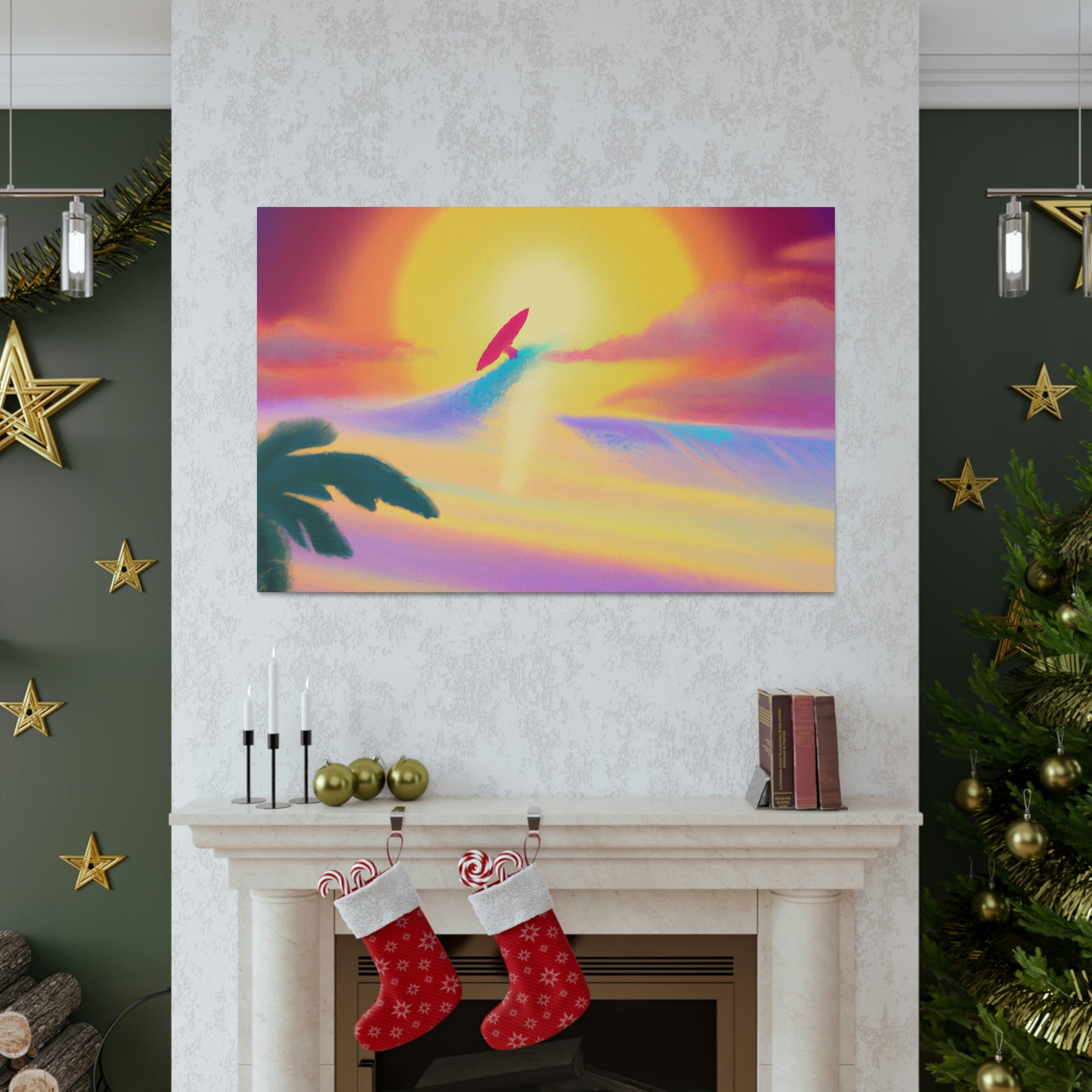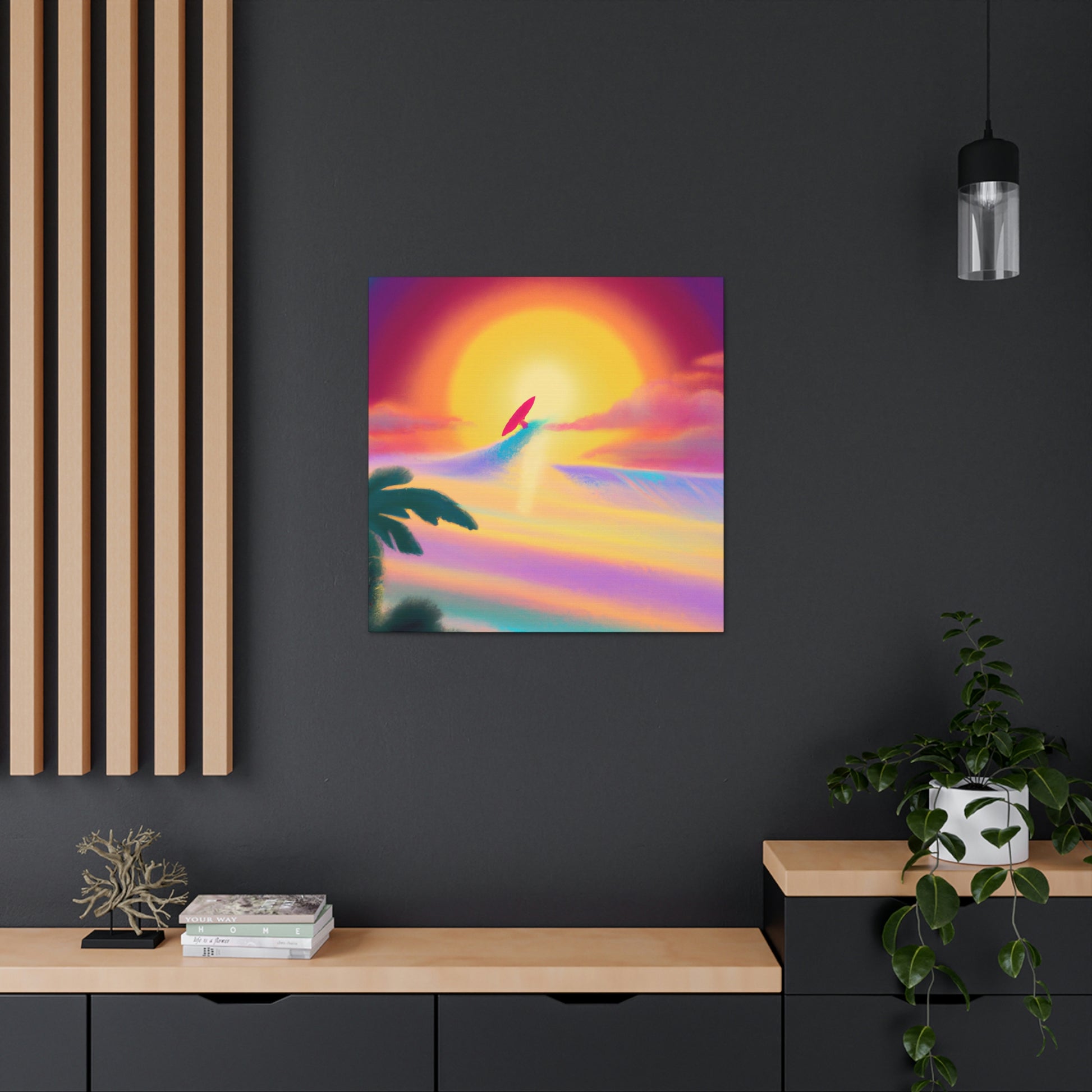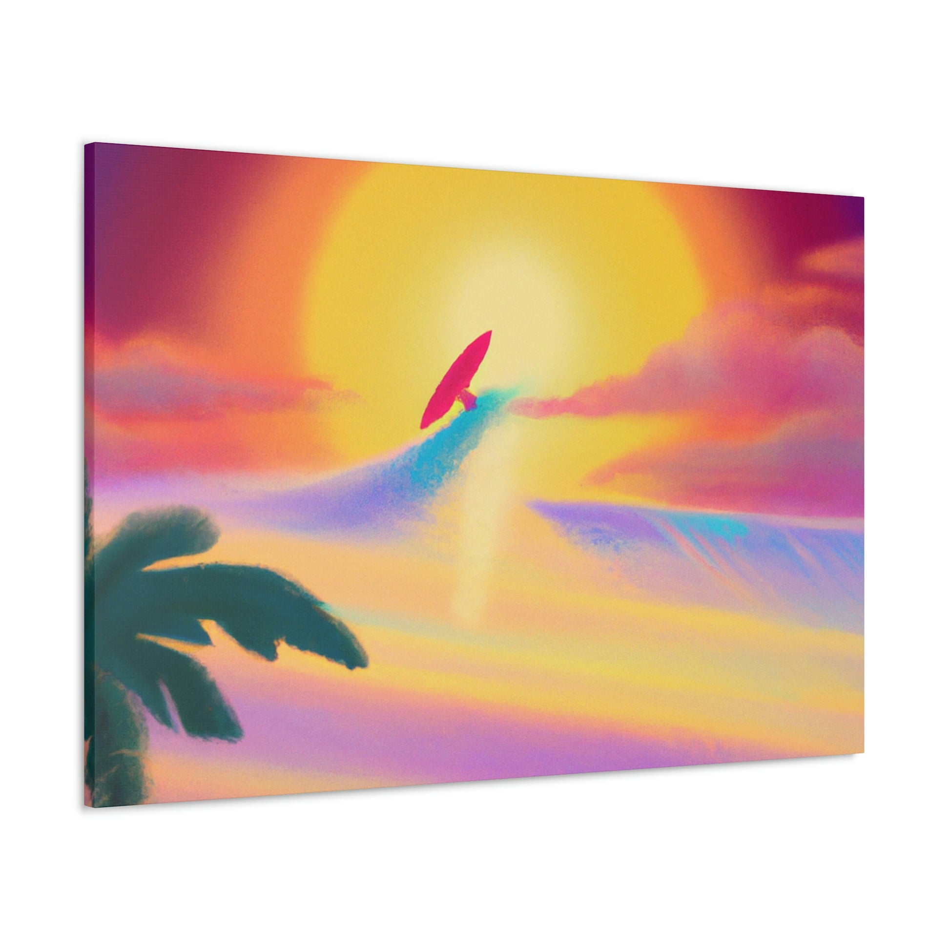 Our Create an 80's surf style art painting is a perfect way to instantly add the vibe of the seaside to any room. This canvas displays deep blue waves and a silhouetted surfer riding the crest of a perfect curl. Hang this digital art masterpiece and you'll be instantly taking a trip back to the golden age of surfing! #surf #art #seascape #ocean #digitalart #saltyair #seaside #wave #surfstyle #vintage #80s