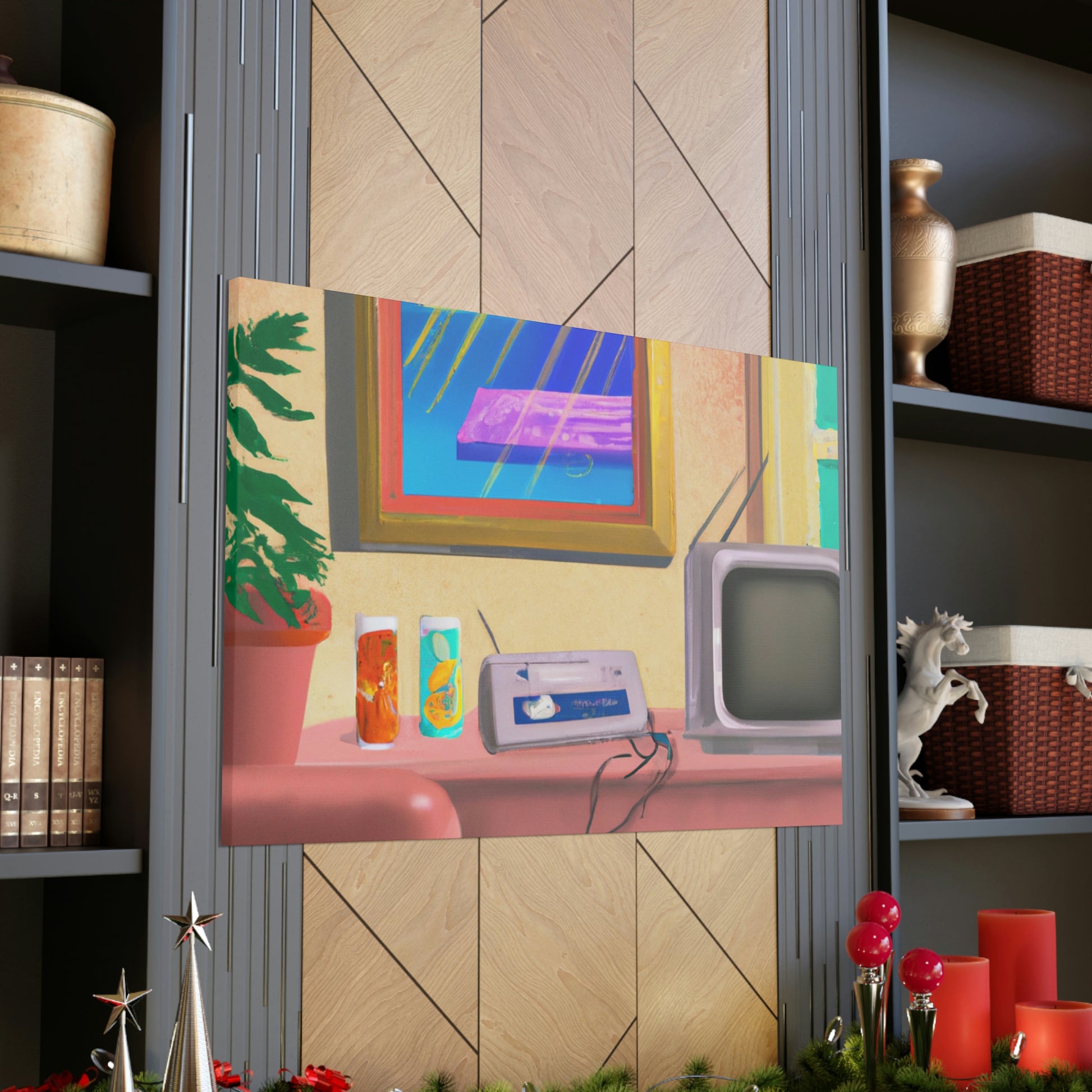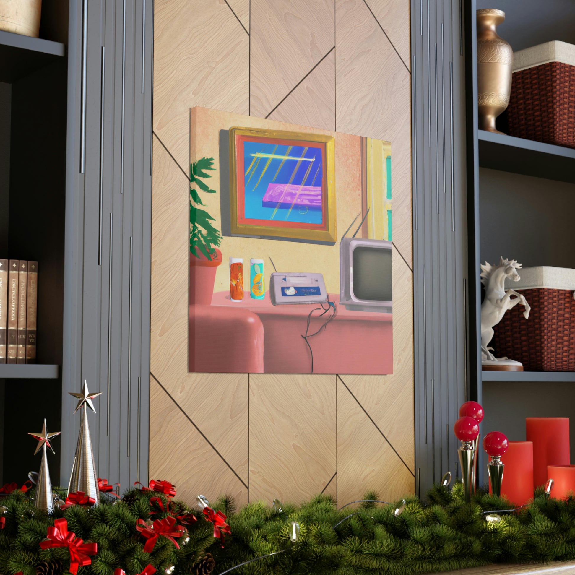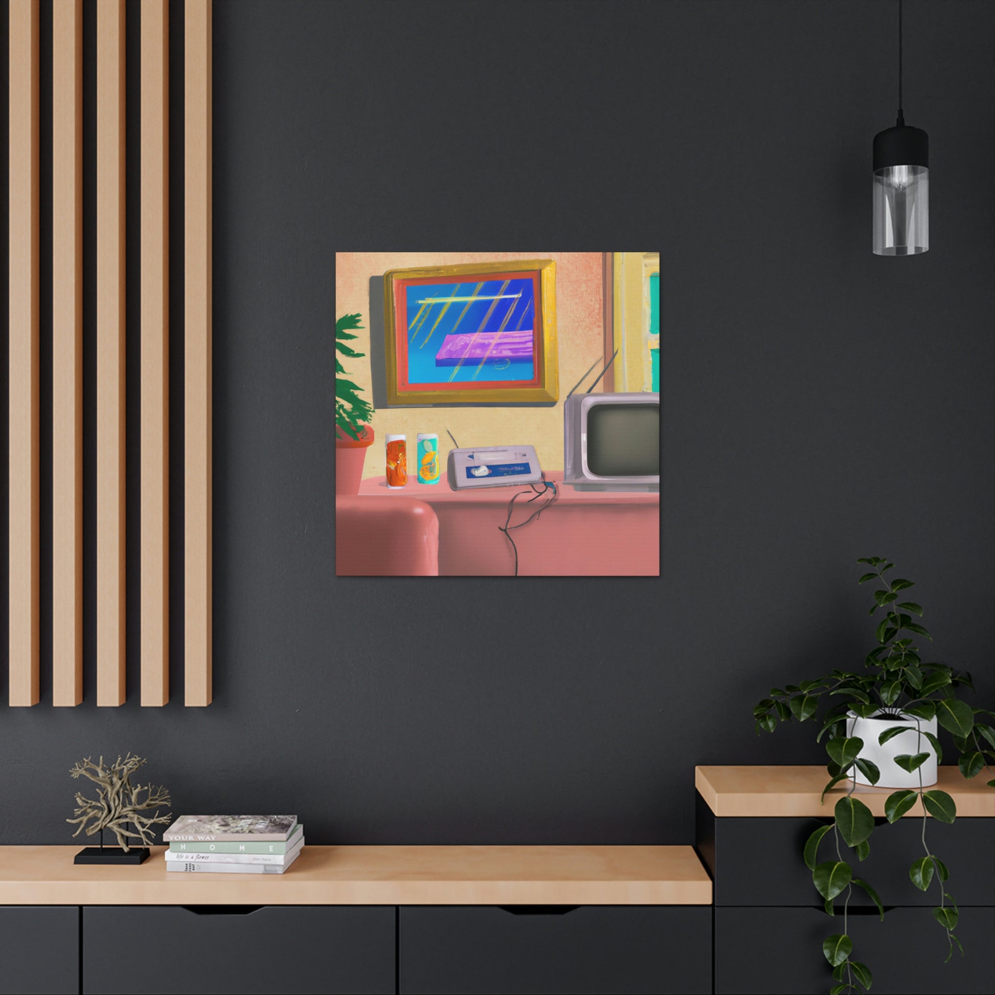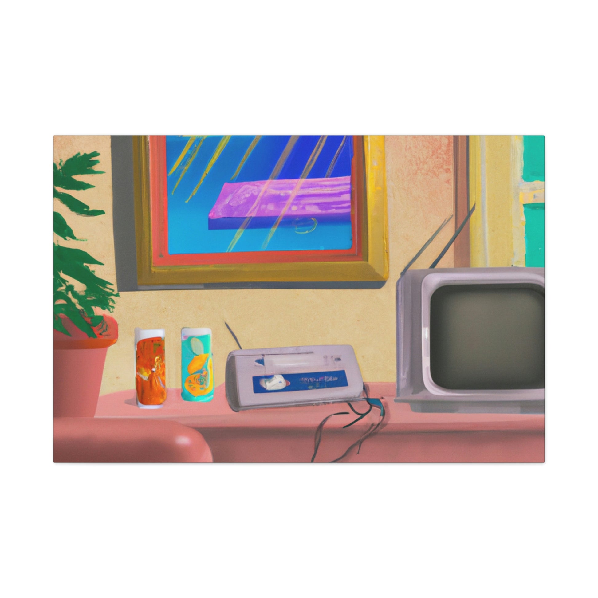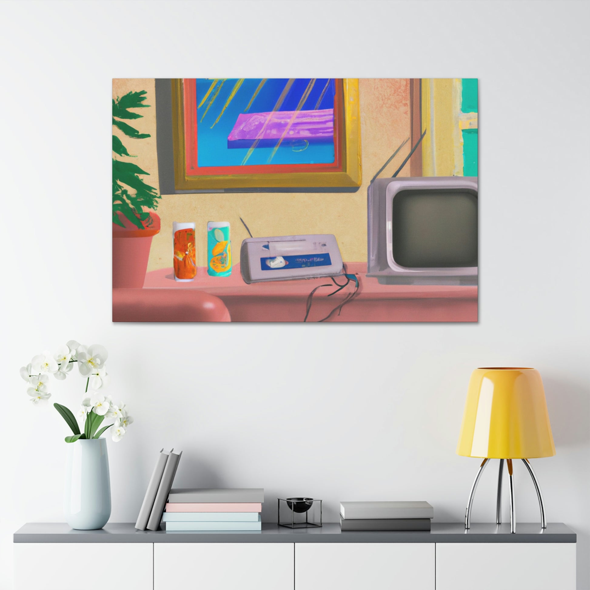 This An 80's pastel digital art piece is perfect decor for any living room. This canvas showcases the vivid pastel colors of the era, rendering a unique yet calming ambiance. The bright tones and charming shapes make it a great conversation starter and a must-have piece. #Pastel #80s #DigitalArt #LivingRoom #Canvas #Bright #Colorful #Unique #Vivd #Ambiance #Charming