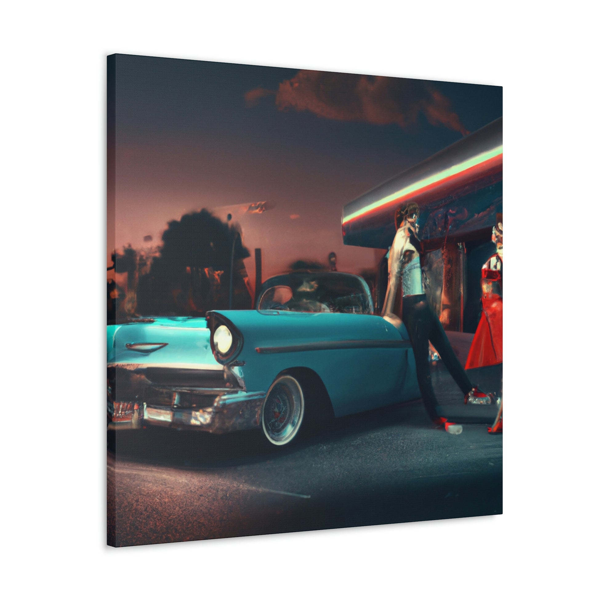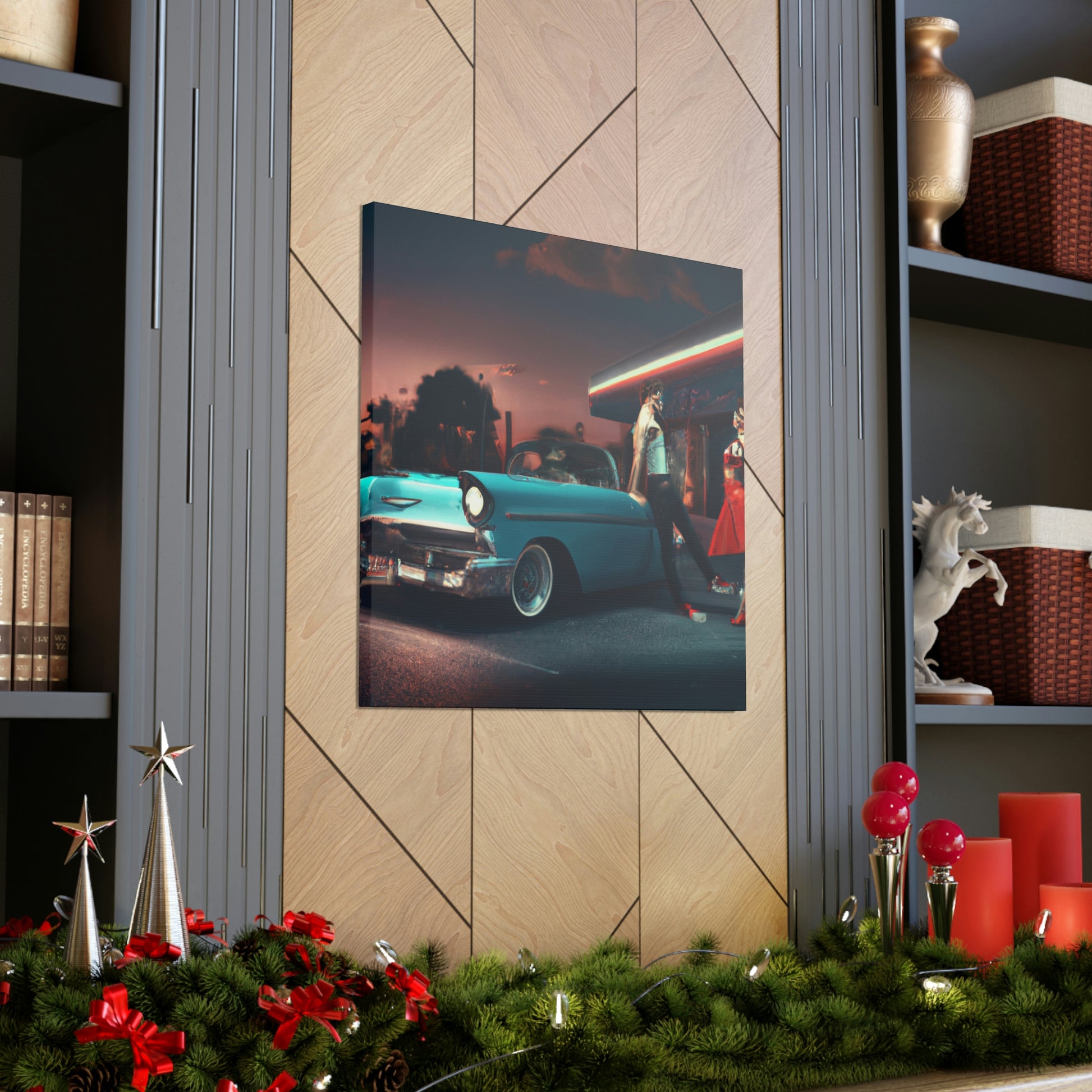 This vintage-inspired digital art canvas of a sultry 50's style rockabilly couple dating in front of an old 50's style car is sure to bring a nostalgic feel to any home or office. Brimming with romance and retro style, this canvas will transport you back to the days of drive-in movies and innocence. #rockabillyculture #50sstyle #vintagedigitalart #nostalgia #retrostyle #canvasart #50svibes #driveinmovies #rockabillycouple #romanceart #vintagecarandcanvasart