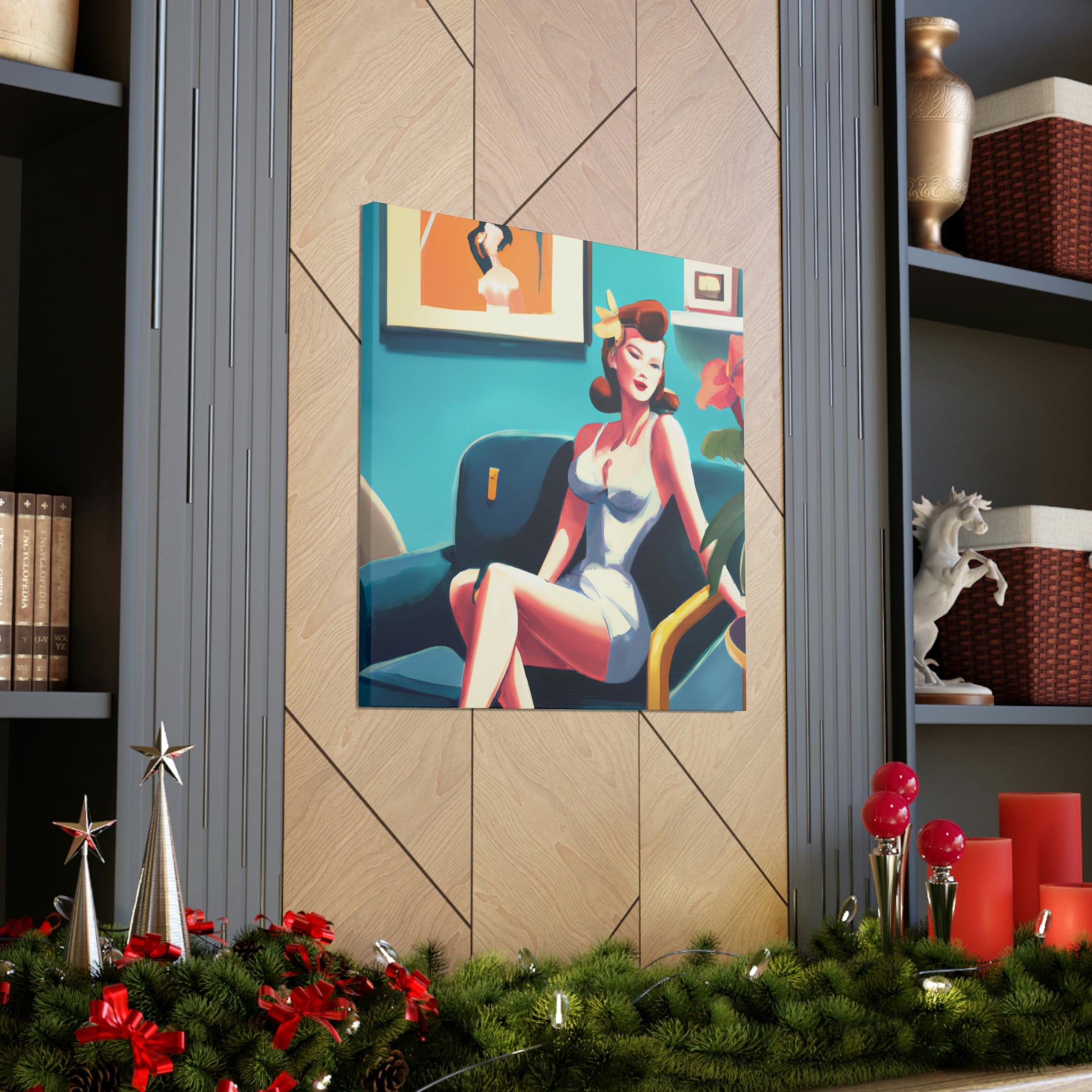 This classic 50's digital pin up painting is perfect to add that vintage charm to your living room. With vivid colors and a unique, playful style, this digital art will be a great addition to your home. This canvas is sure to make your rooms look alive, and will bring a touch of nostalgia to your home. #50sstyle #digitalart #vintageart #canvasart #pinupstyle #anart #roomdecor #nostalgia #classicstyle #artisticstyle #homedecor